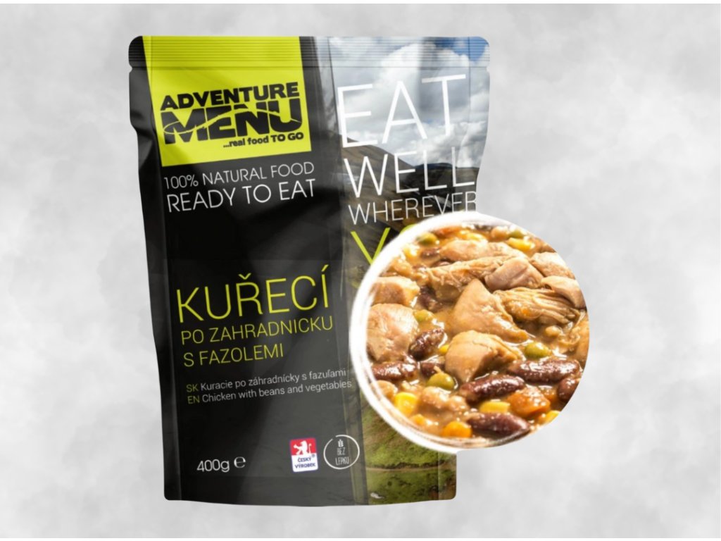 Adventure Menu – Kuřecí po zahradnické s fazolemi (400 g) je skutečný parťák pro outdoorové nadšence, dobrodruhy i minimalistické batůžkáře. Jedná se o sterilizované jídlo připravené v ČR z lokálních surovin. Jednotlivé kousky kuřecího stehenního masa (30 %) jsou jemně dušené na páře, aby zůstaly šťavnaté, obklopené zářivým mixem zeleniny: kukuřice, hrášek a baby karotka. Cibulová omáčka spojuje chuťový celek a dva druhy fazolí (20 %) dodávají téhle zdravé symfonii výživnou hloubku plnou bílkovin a vlákniny.