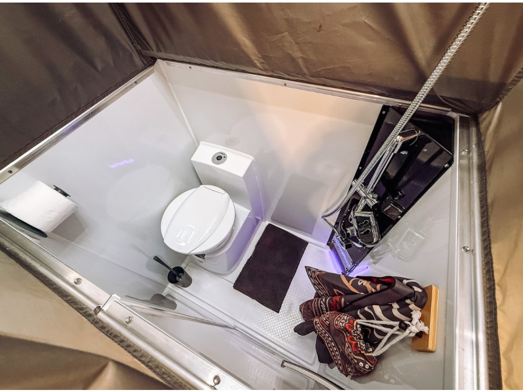 Koupelna: Součástí karavanu je toaleta a sprcha