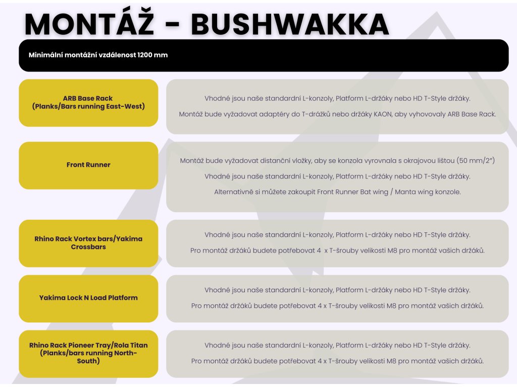 ARB Base Rack (Planks/Bars running East-West): Vhodné jsou naše standardní L-konzoly, Platform L-držáky nebo HD T-Style držáky. Montáž bude vyžadovat adaptéry do T-drážků nebo držáky KAON, aby vyhovovaly ARB Base Rack.